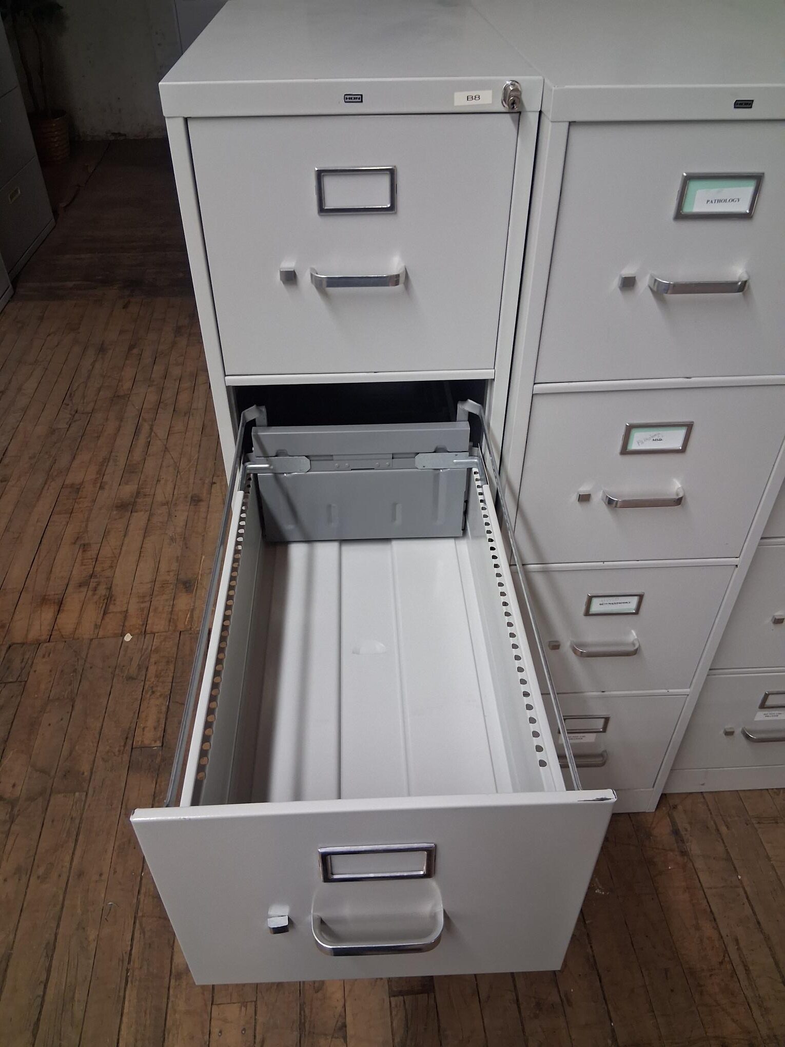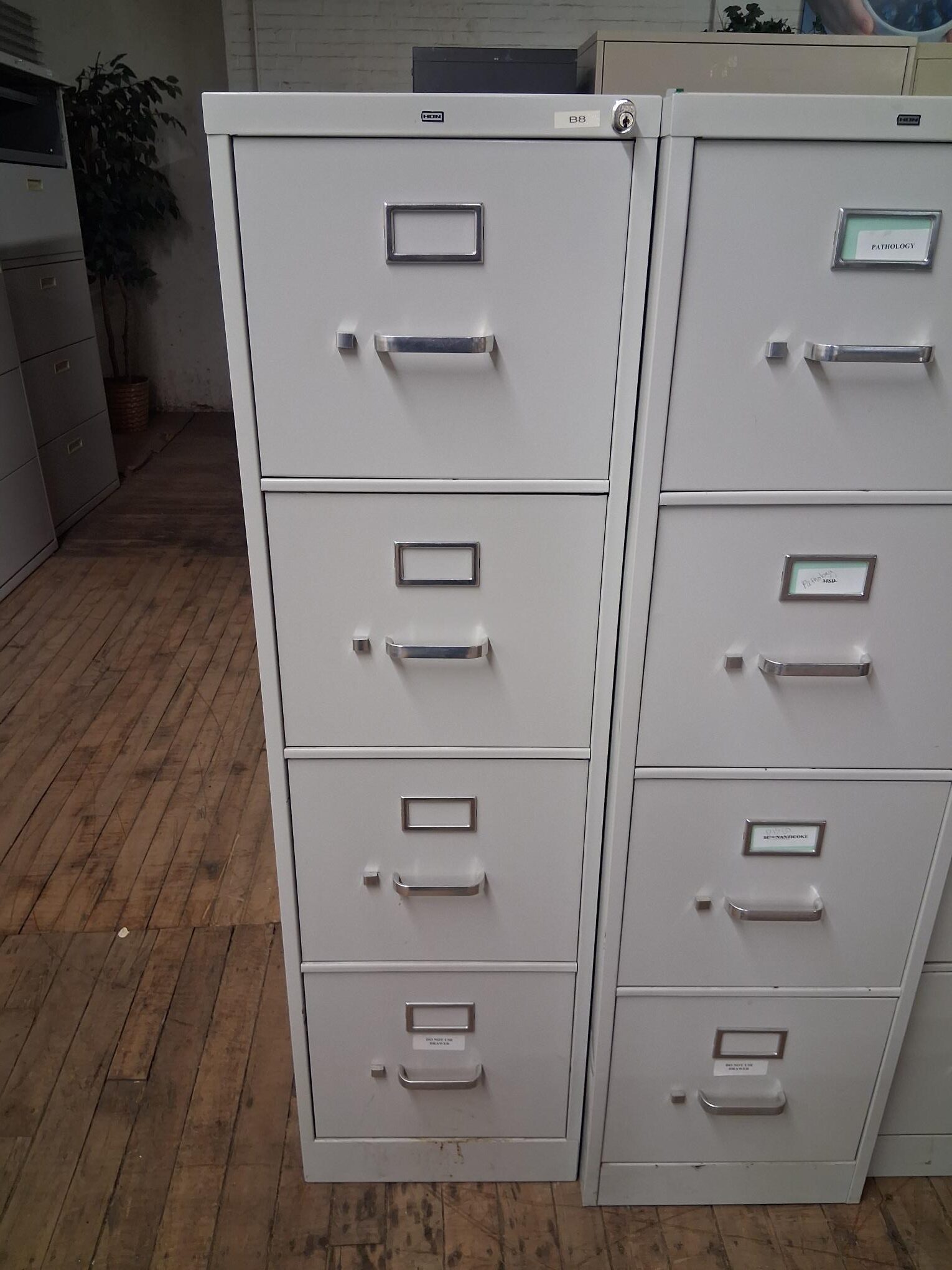 This 4 Drawer HON filing cabinet in light grey is a classic, heavy-duty office staple known for its durability and smooth operation. Built to handle high-volume filing, this commercial-grade steel unit is perfect for organizing letter-sized documents in any professional or home office.
