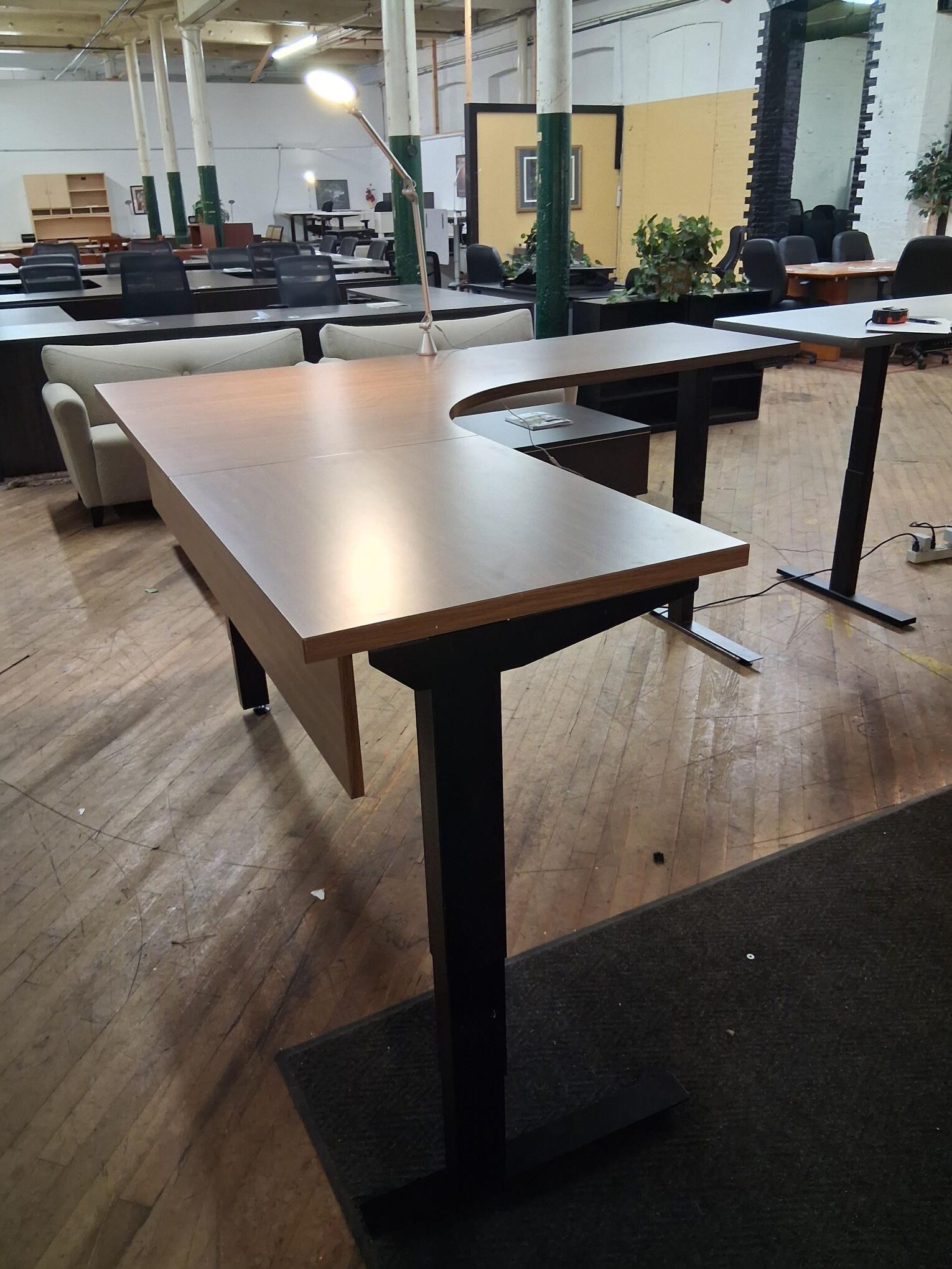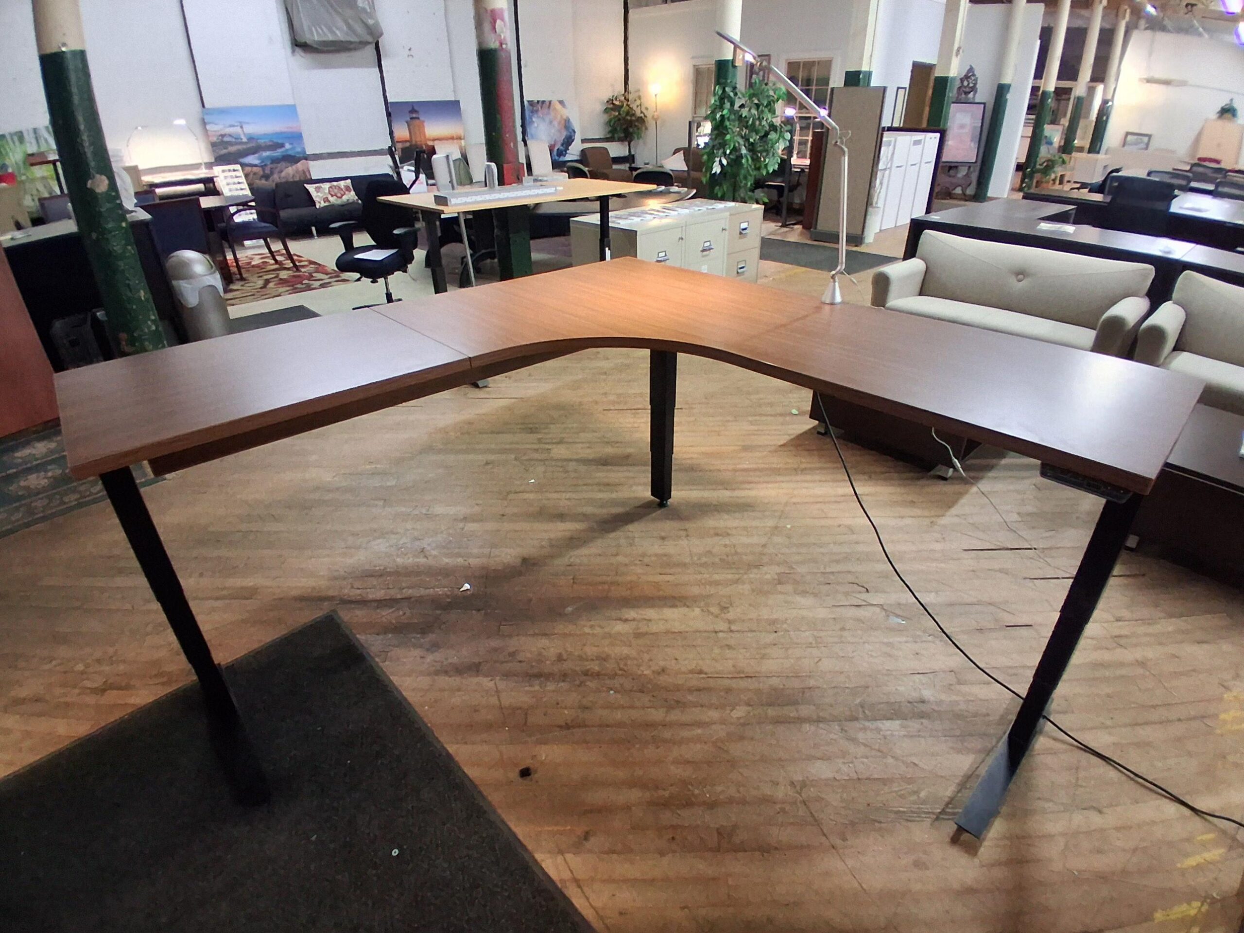Upgrade your workspace with this high-performance, L-shaped electric standing desk. Combining the rich look of warm walnut laminate with cutting-edge ergonomic technology, this desk is designed to support your health and productivity throughout the workday.
