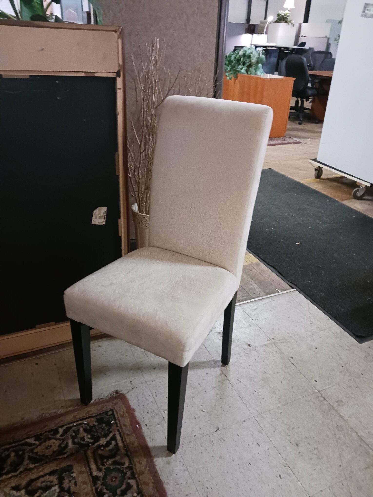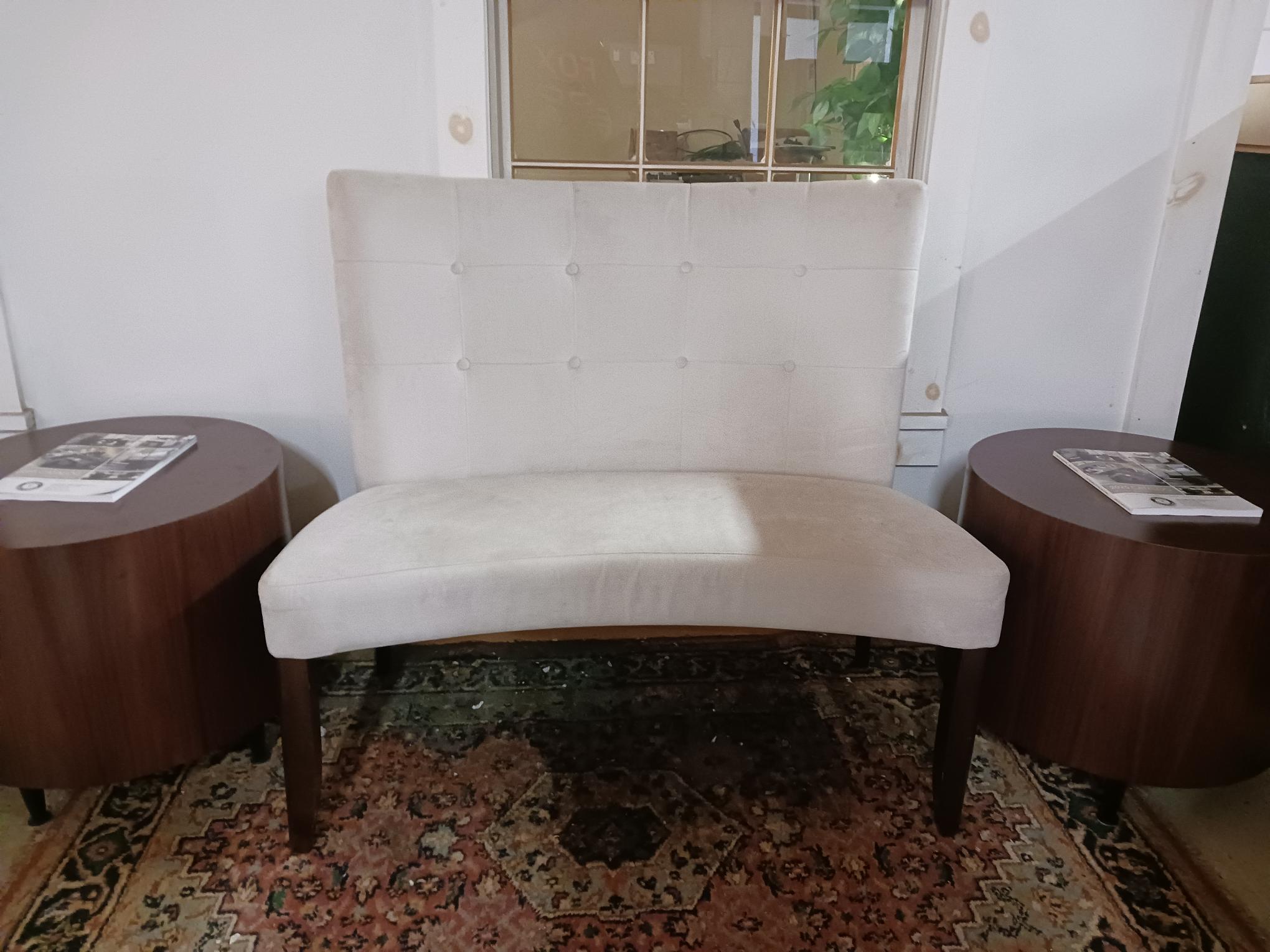 White fabric lounge seating, one bench type seat and two 4-post chairs