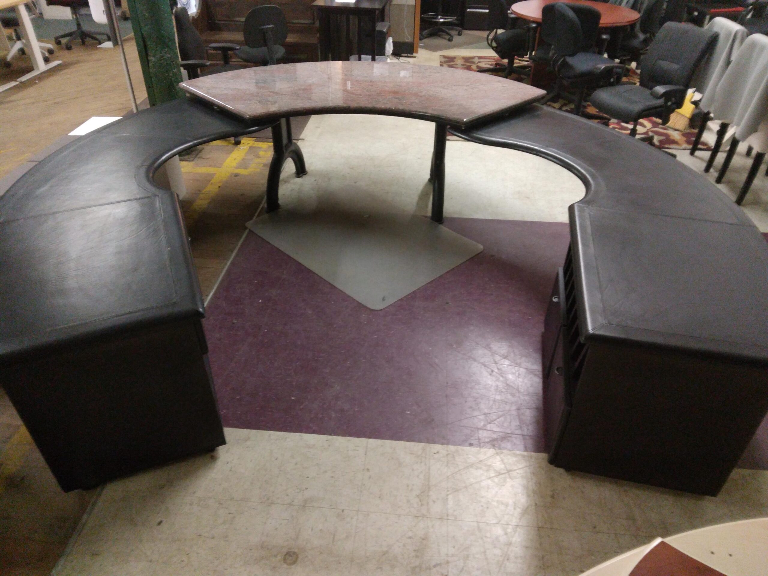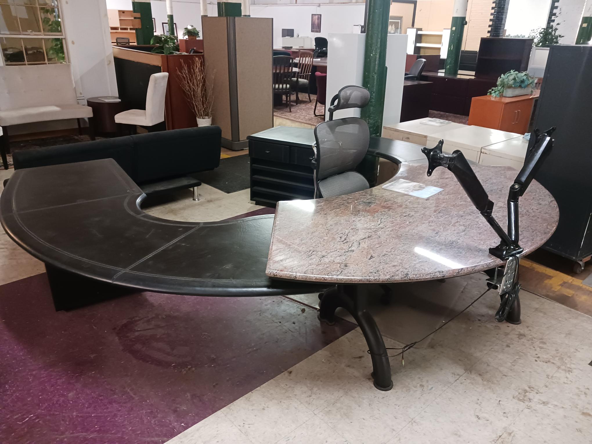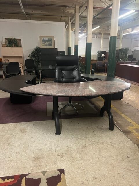 • Premium Materials: A polished granite desktop provides a sophisticated, durable surface that’s easy to maintain. The soft, leather wrap-around returns on each side add a touch of executive style and a comfortable boundary for visitors.