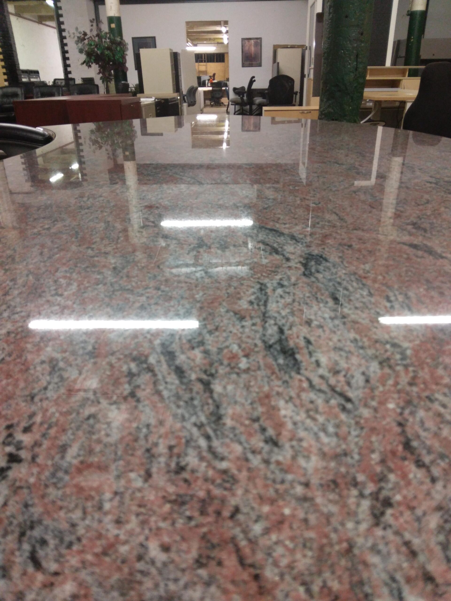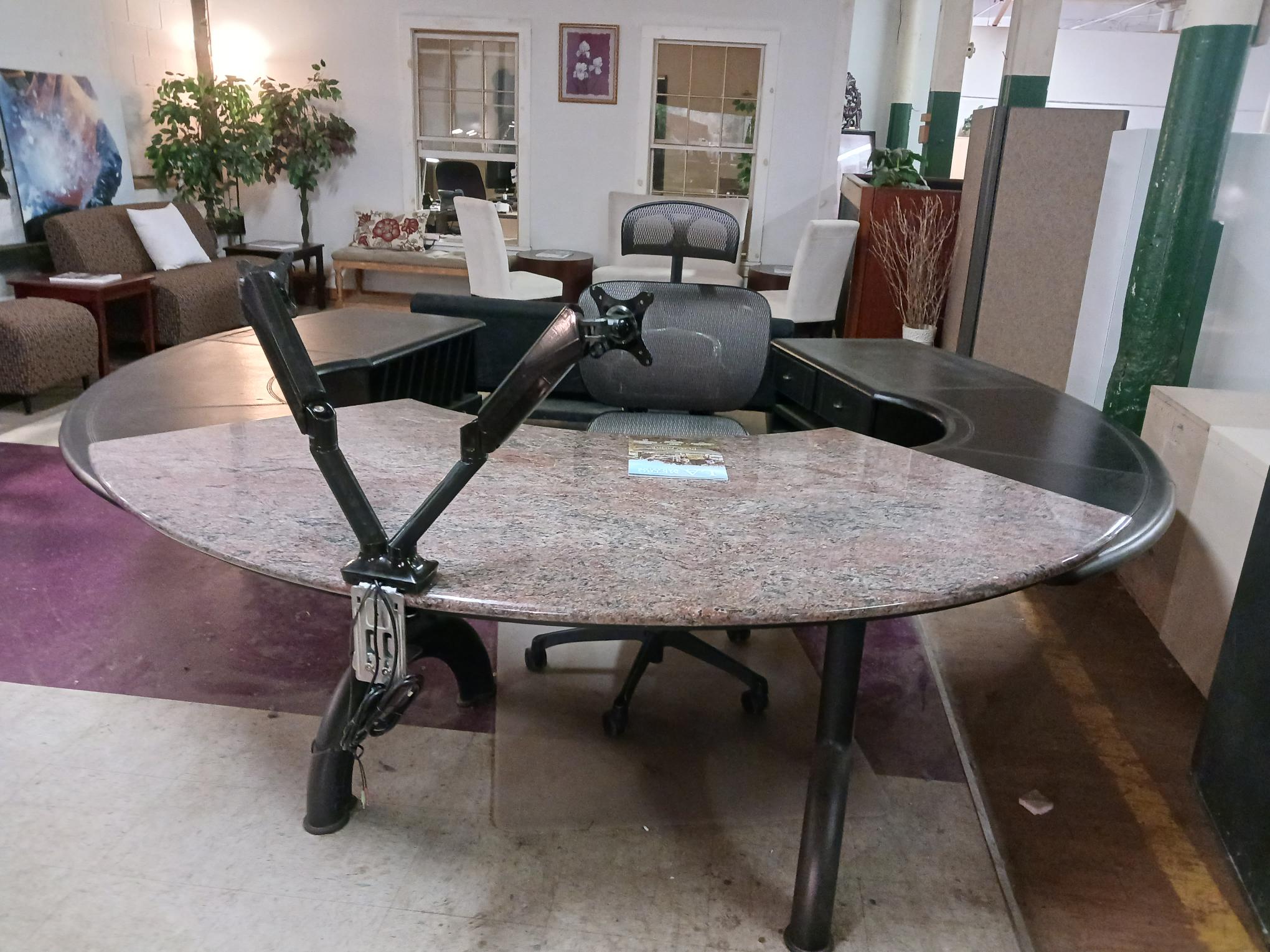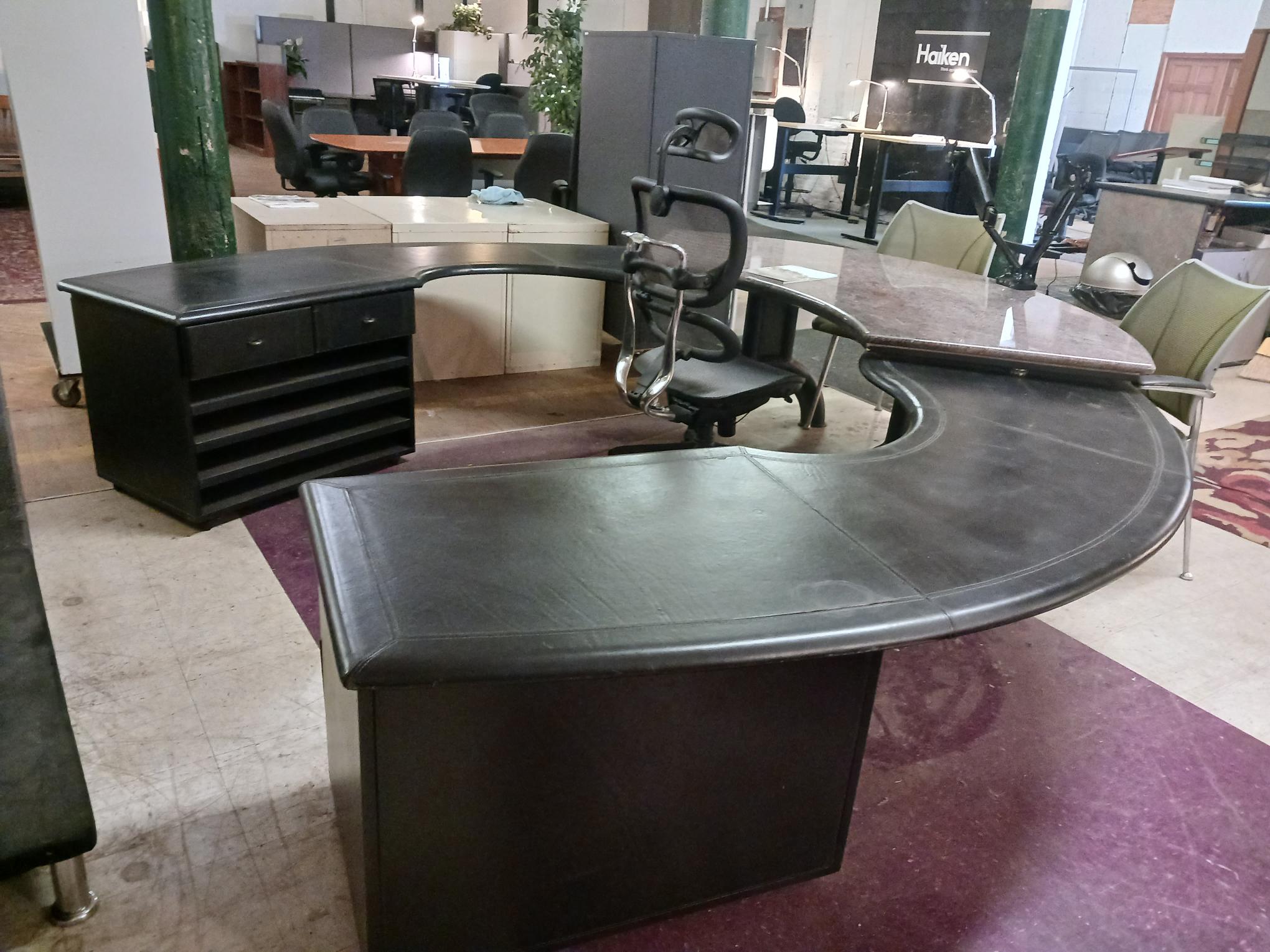 • Premium Materials: A polished granite desktop provides a sophisticated, durable surface that’s easy to maintain. The soft, leather wrap-around returns on each side add a touch of executive style and a comfortable boundary for visitors.