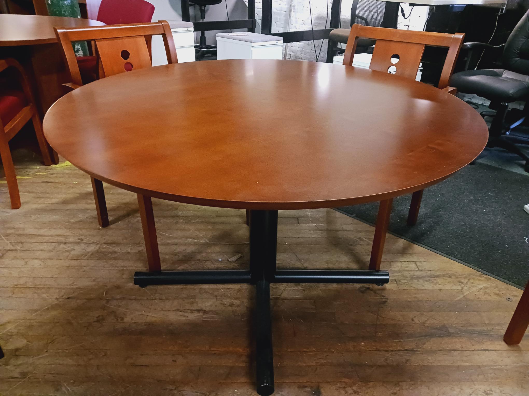 A versatile and professional round table in a classic cherry finish laminate, perfect for impromptu meetings, breakrooms, or training areas. Its robust design is built for convenience and longevity in commercial settings. The 48-inch diameter can comfortably seat four people.