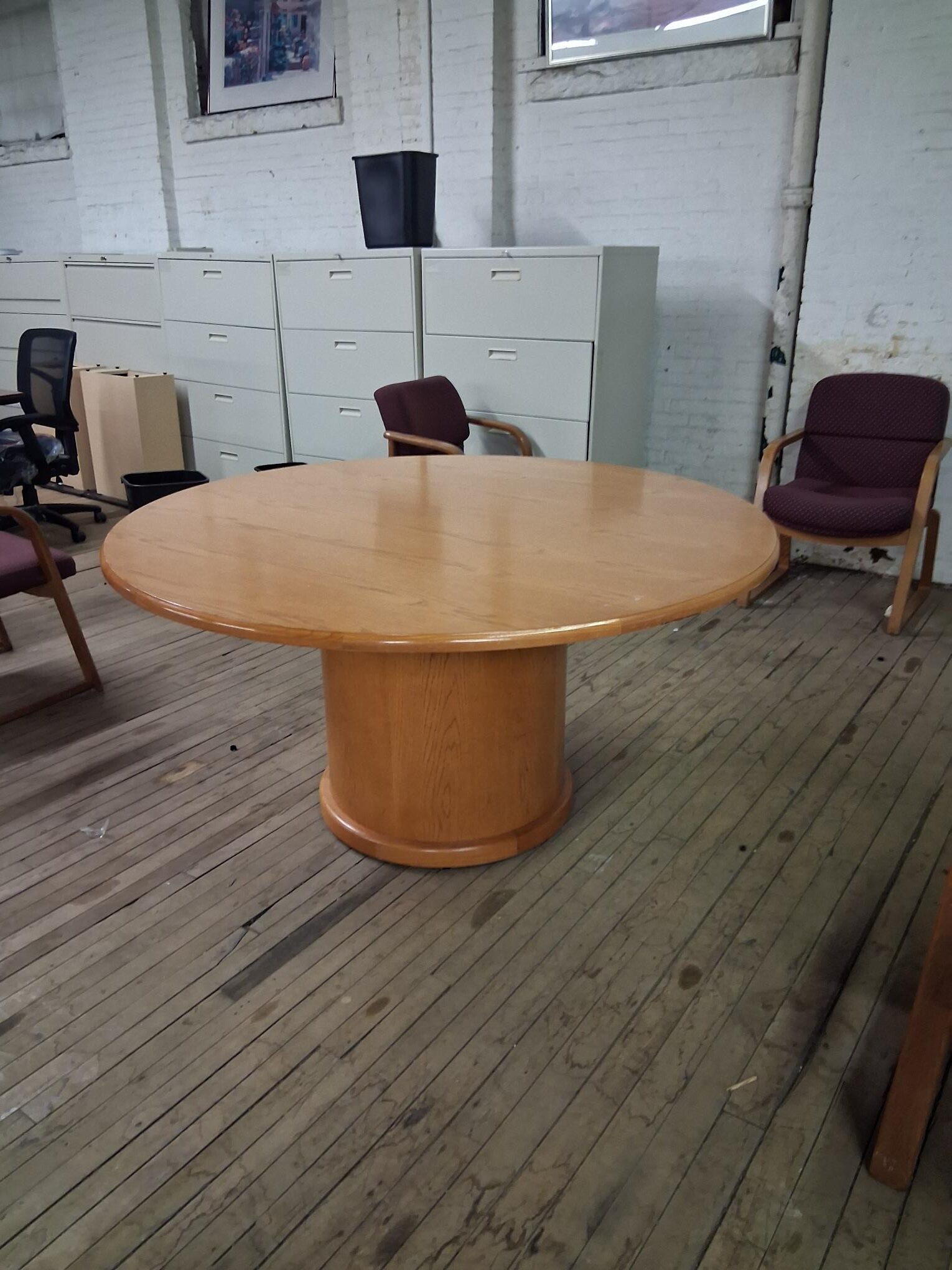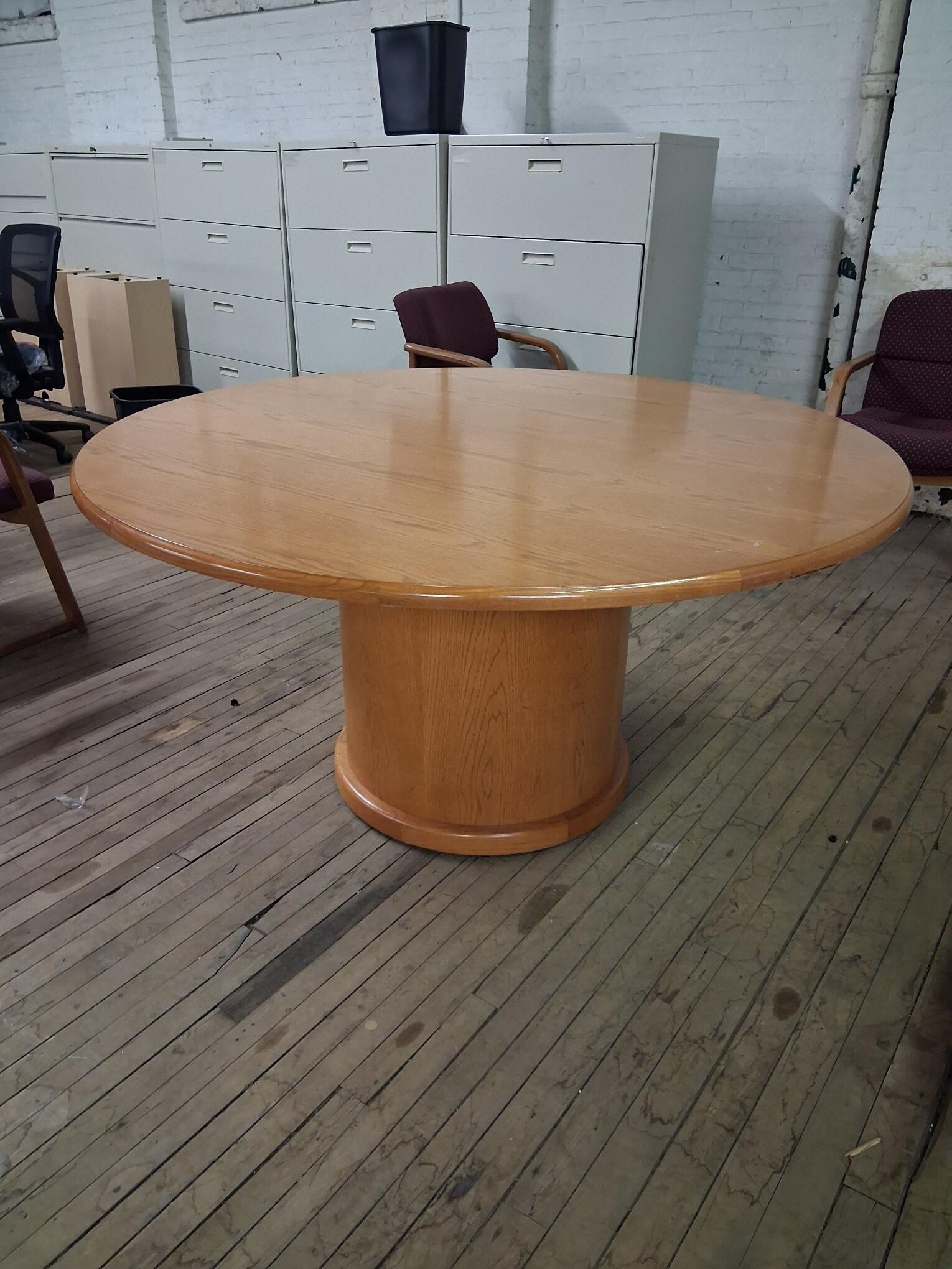 Elevate your meeting space or dining area with this sleek, modern pedestal table. Featuring a clean circular design and a substantial pedestal base, this table combines professional aesthetics with everyday durability.