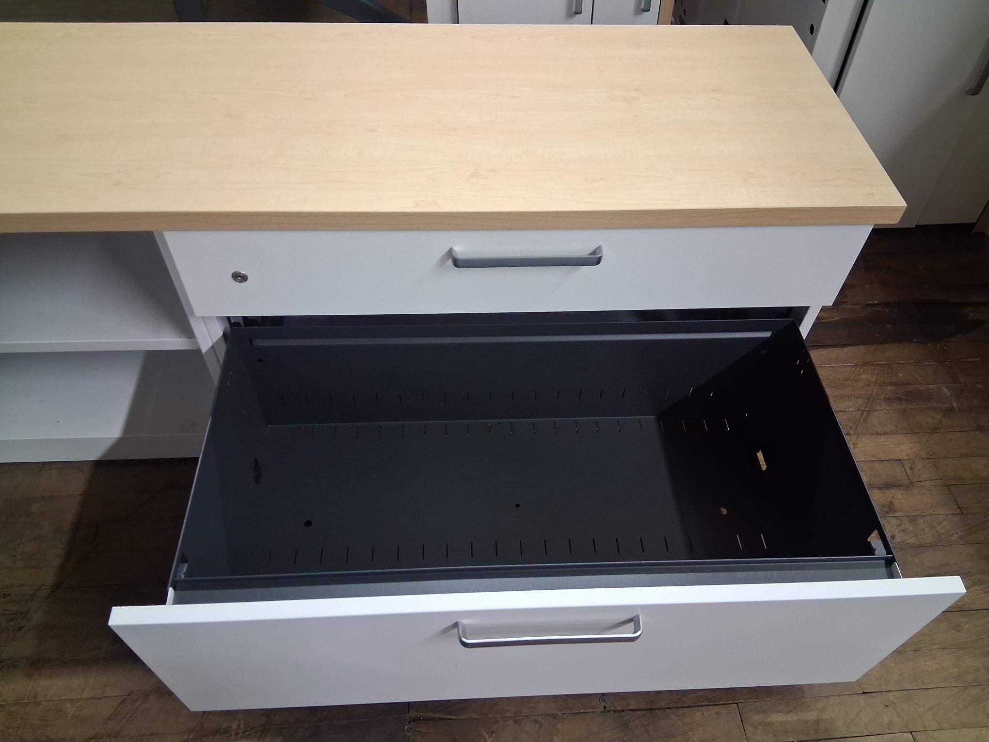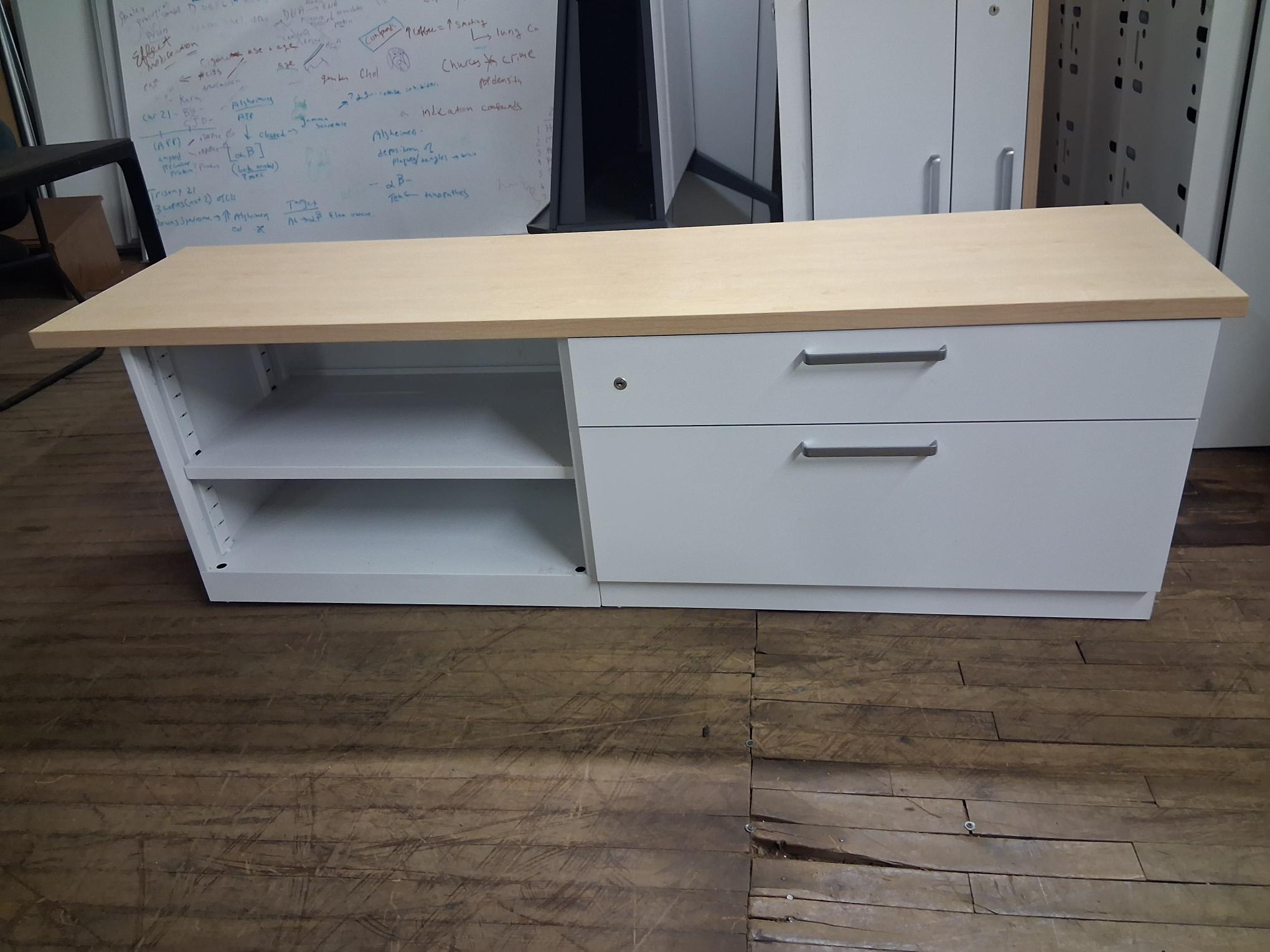 This sleek, low-profile credenza is the perfect blend of modern design and industrial strength. Featuring a crisp white metal body paired with a warm Maple laminate top, it’s designed to provide heavy-duty storage while doubling as a stylish side surface for a printer, coffee station, or additional desk space.