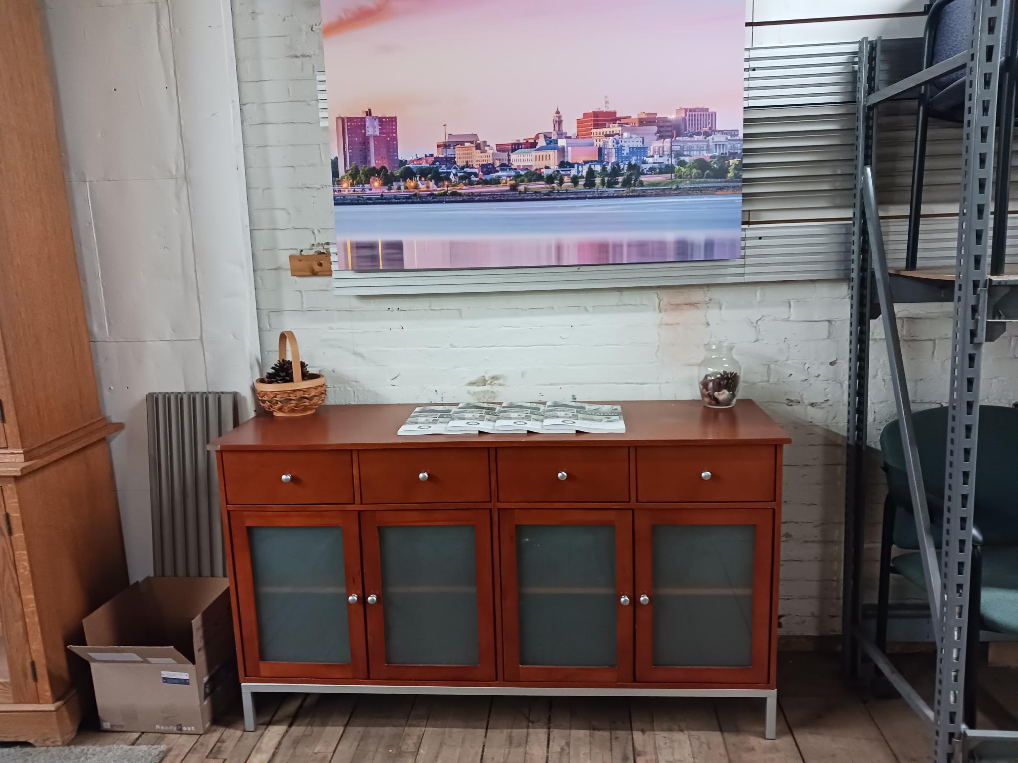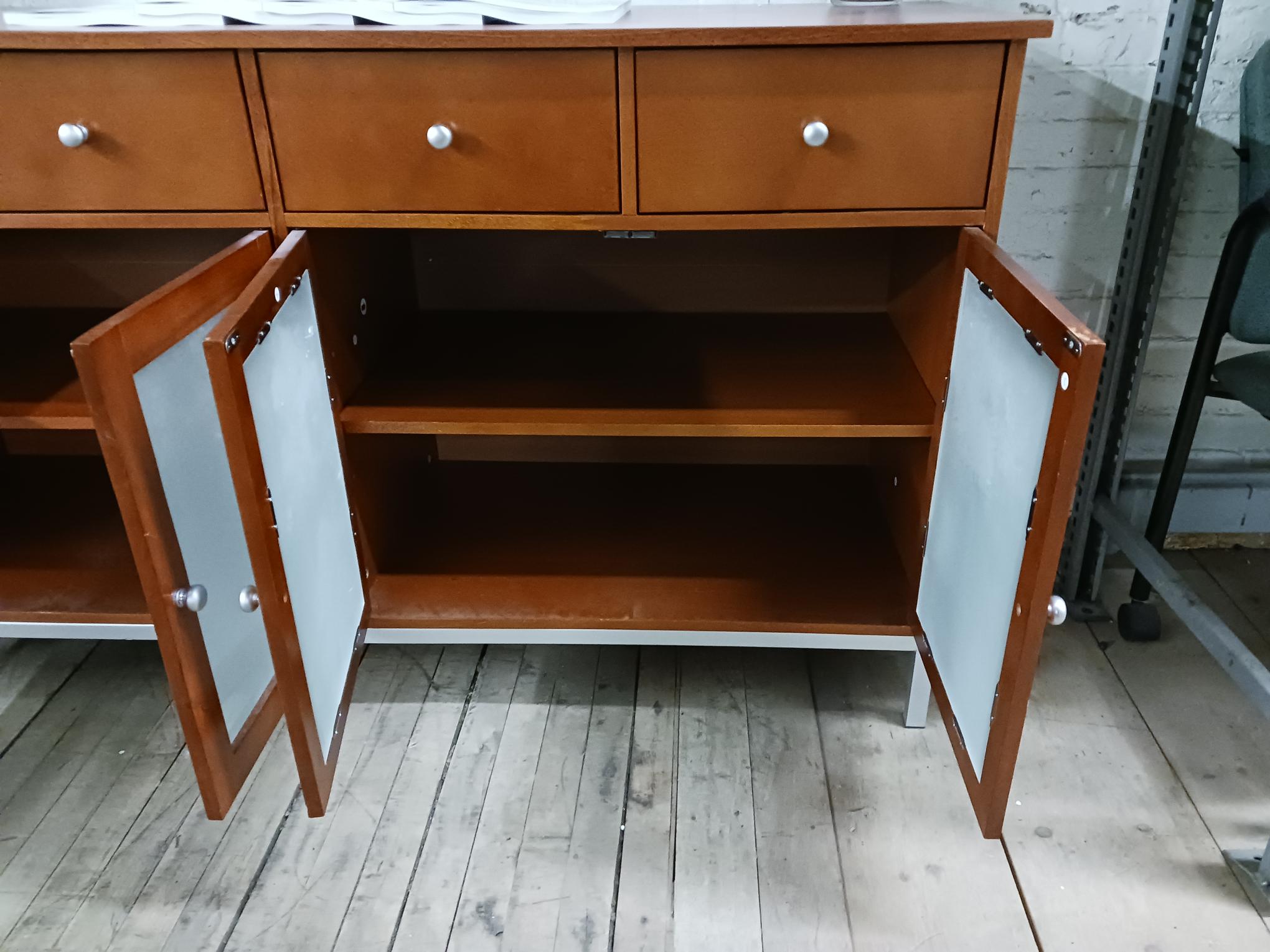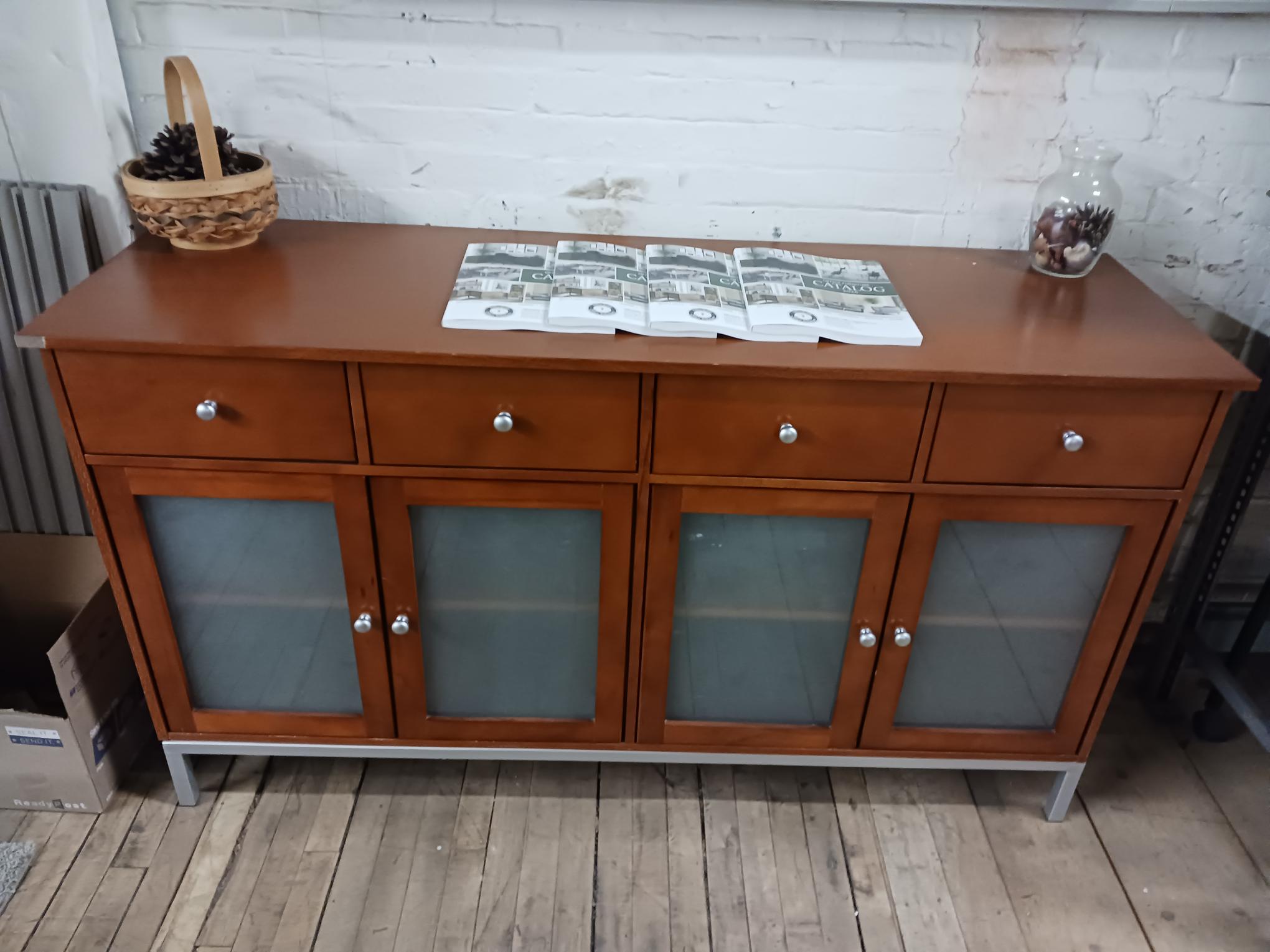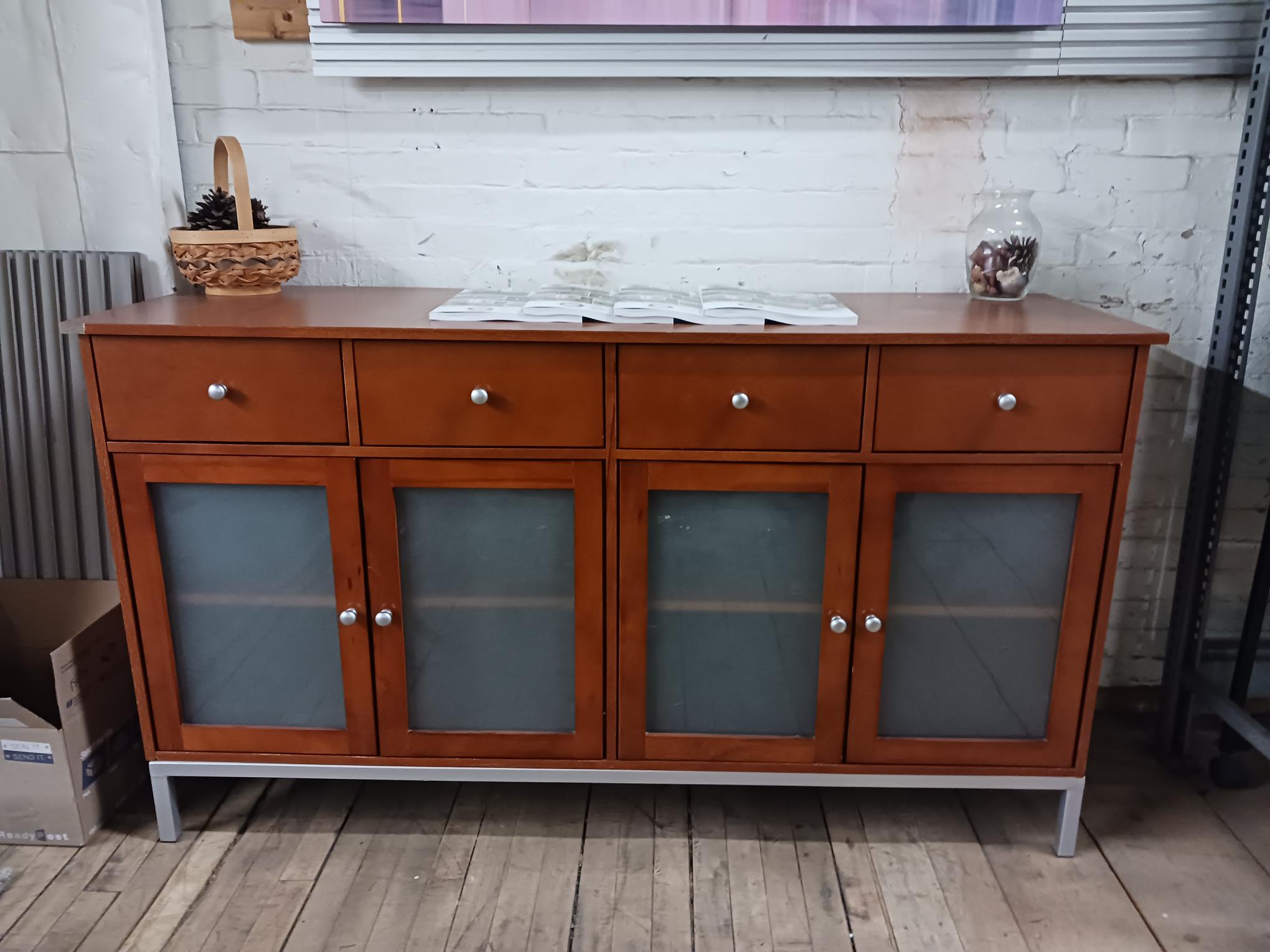 This attractive and highly functional credenza offers ample storage and a sleek, transitional design that blends modern and traditional elements. The warm cherry wood tone finish and frosted glass doors provide an elevated look perfect for a living room, dining area, or office. This piece is a practical and elegant storage solution designed to enhance the organization and style of your space.