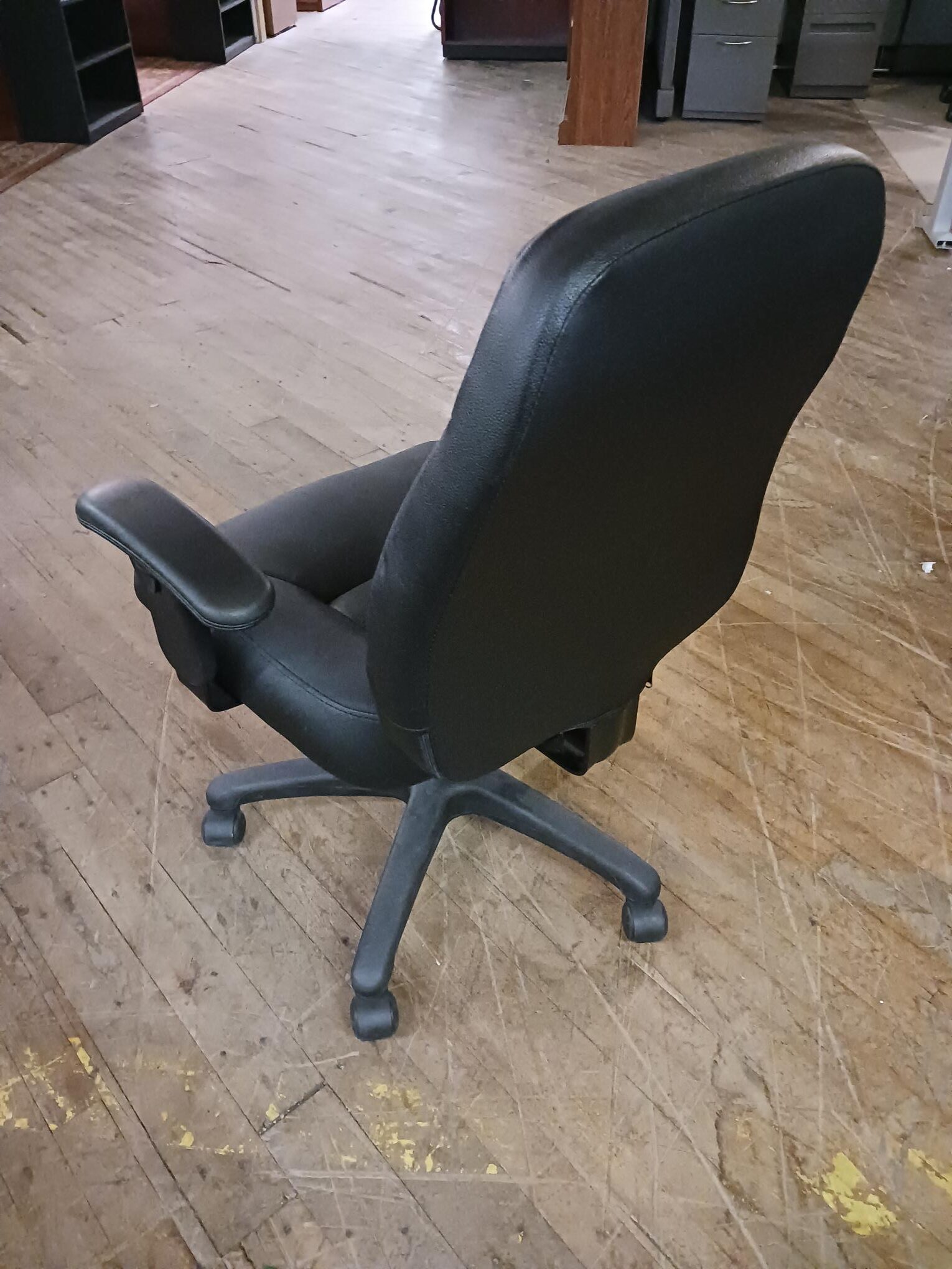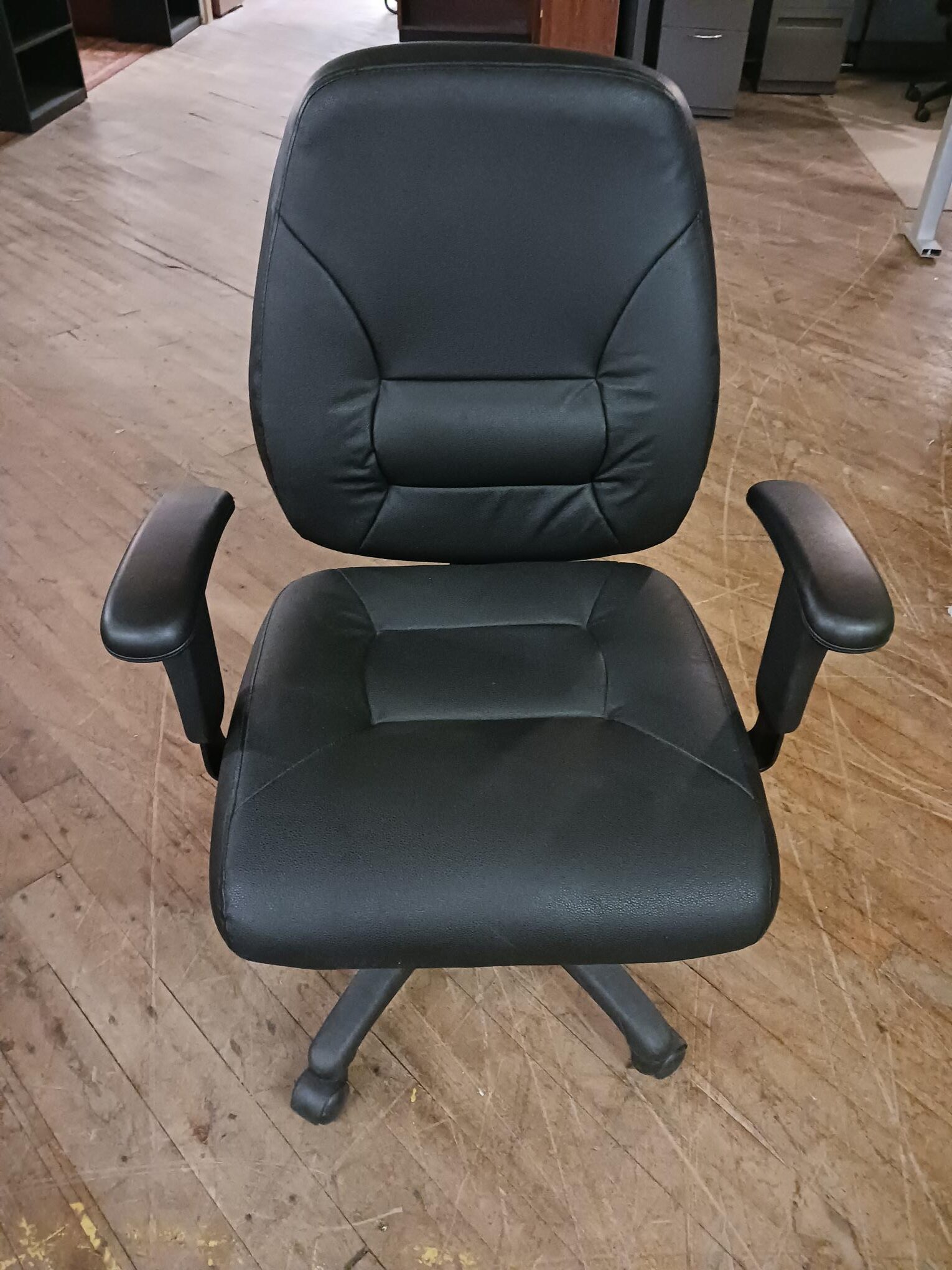 Black leather. mid back. task chair with adjustable seat height and arms.