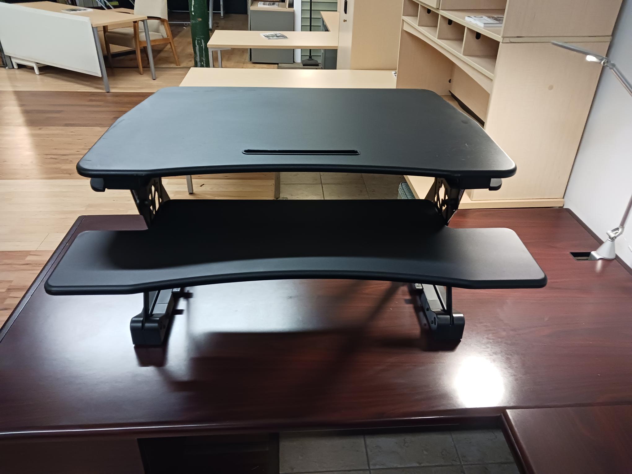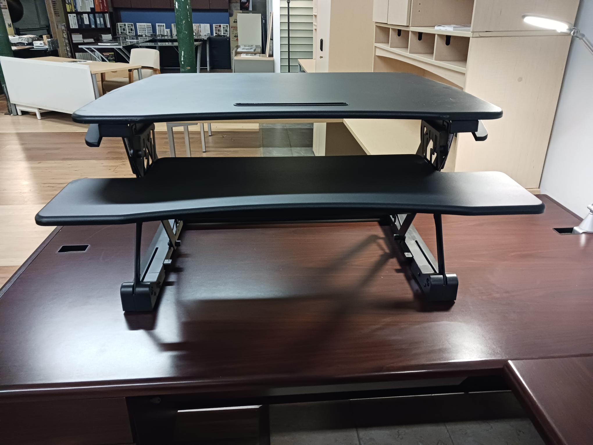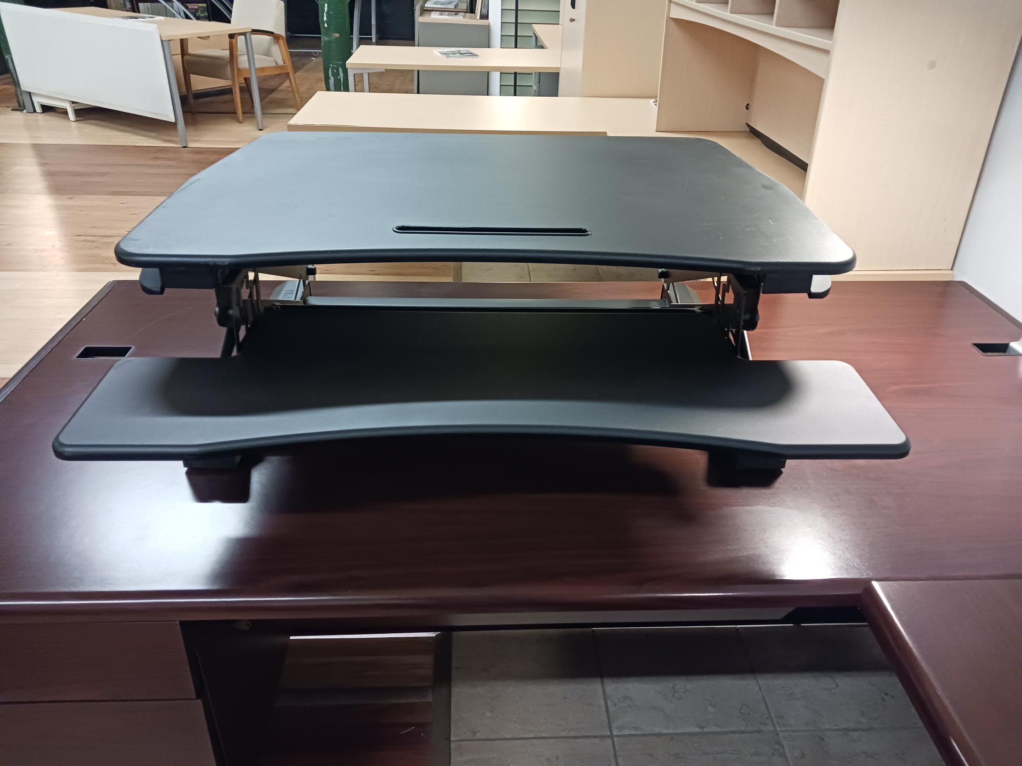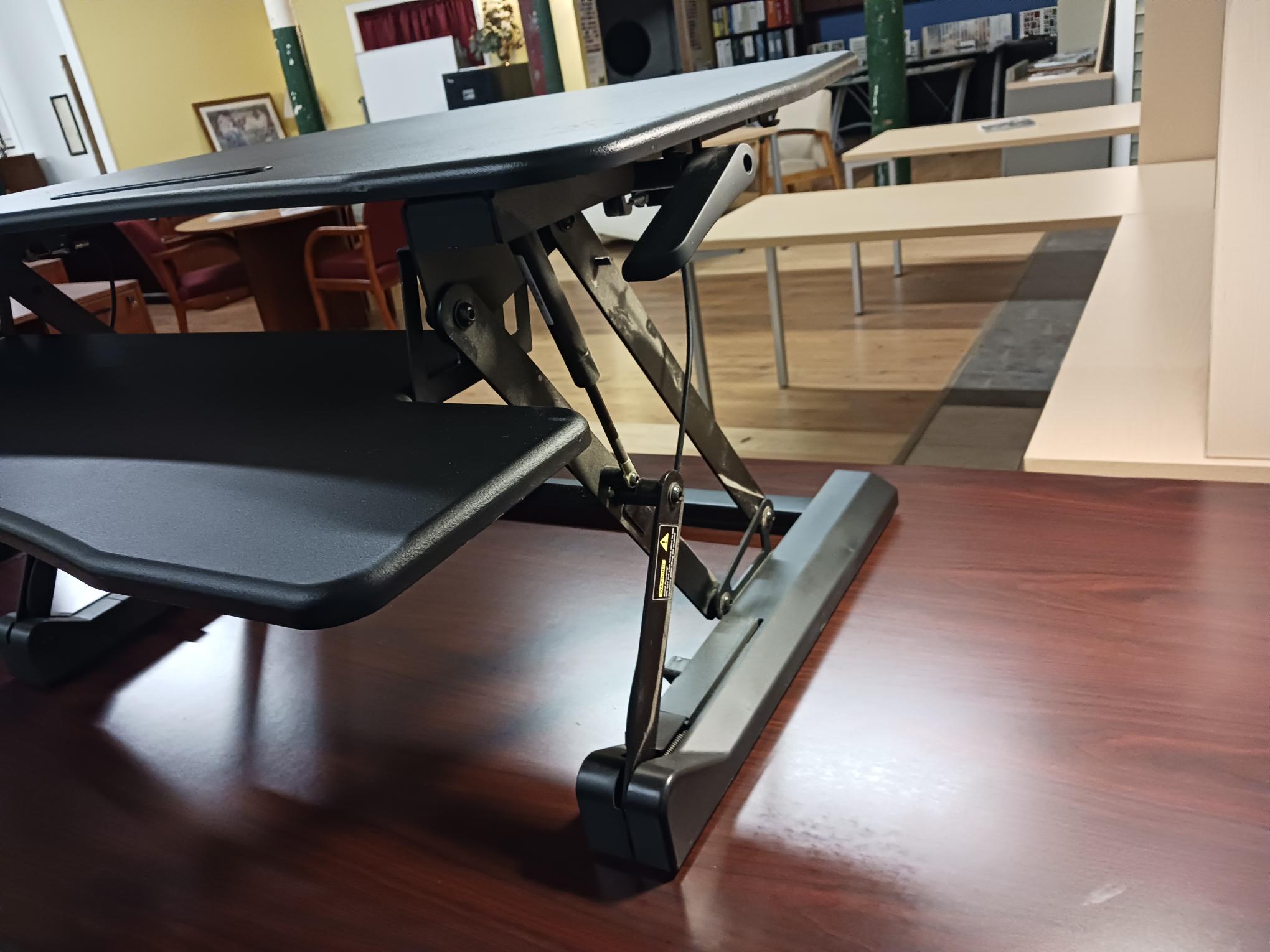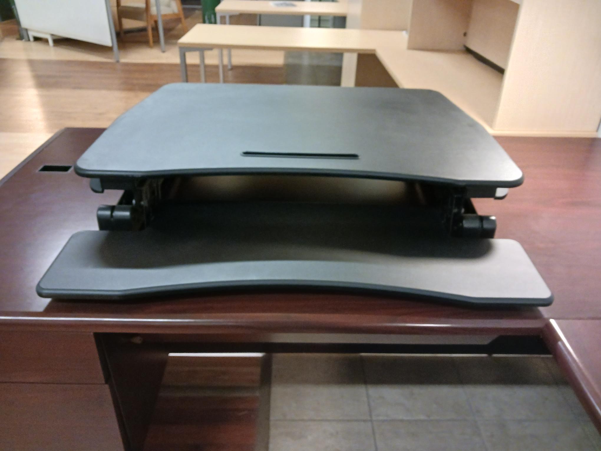 Hand adjustable “Varidesk” for space saving, sit-to-stand environments